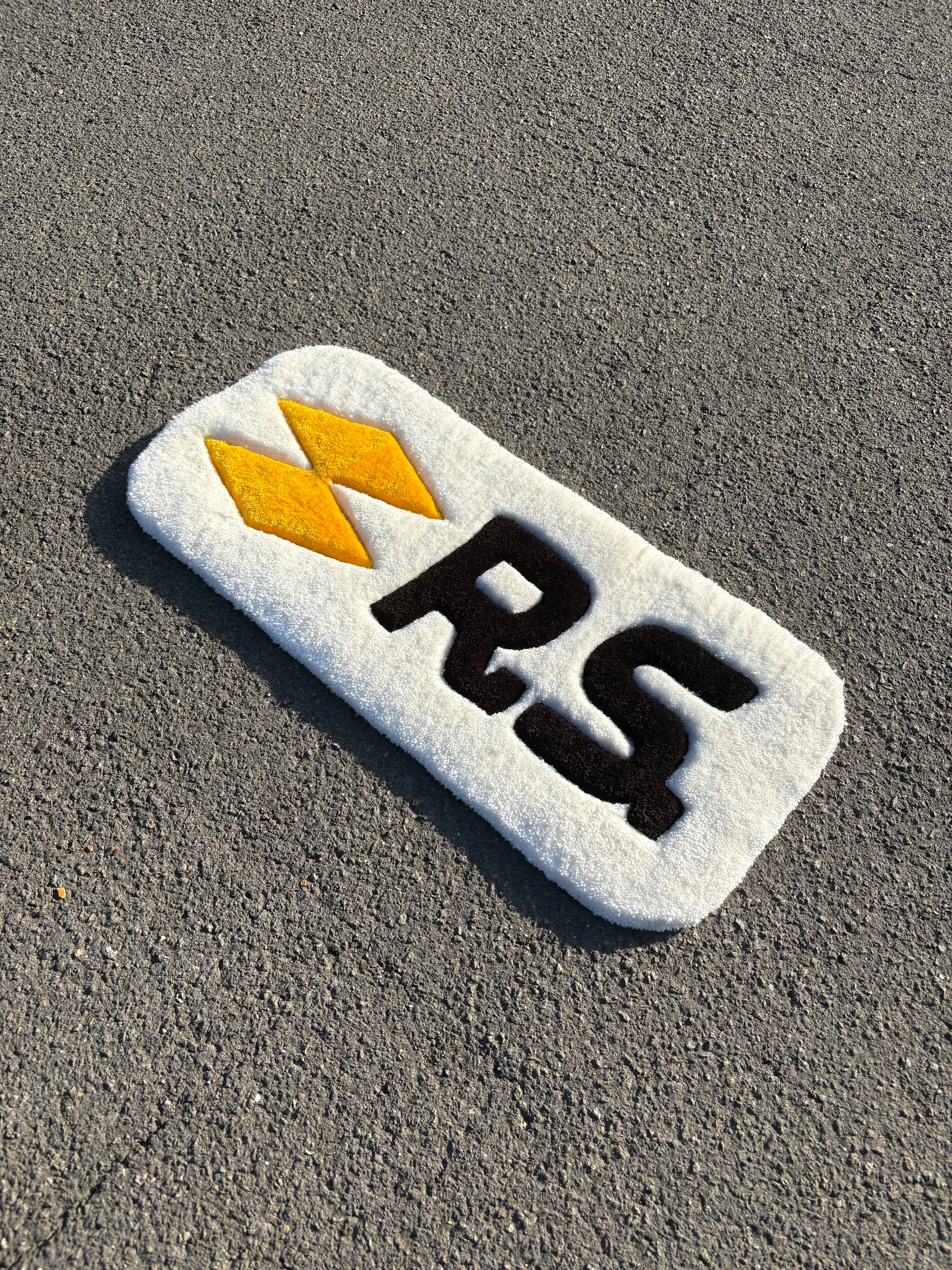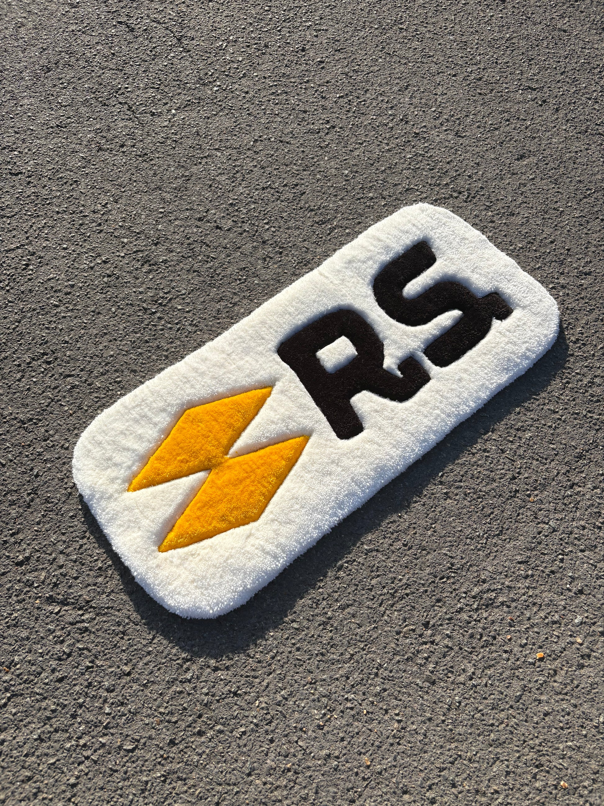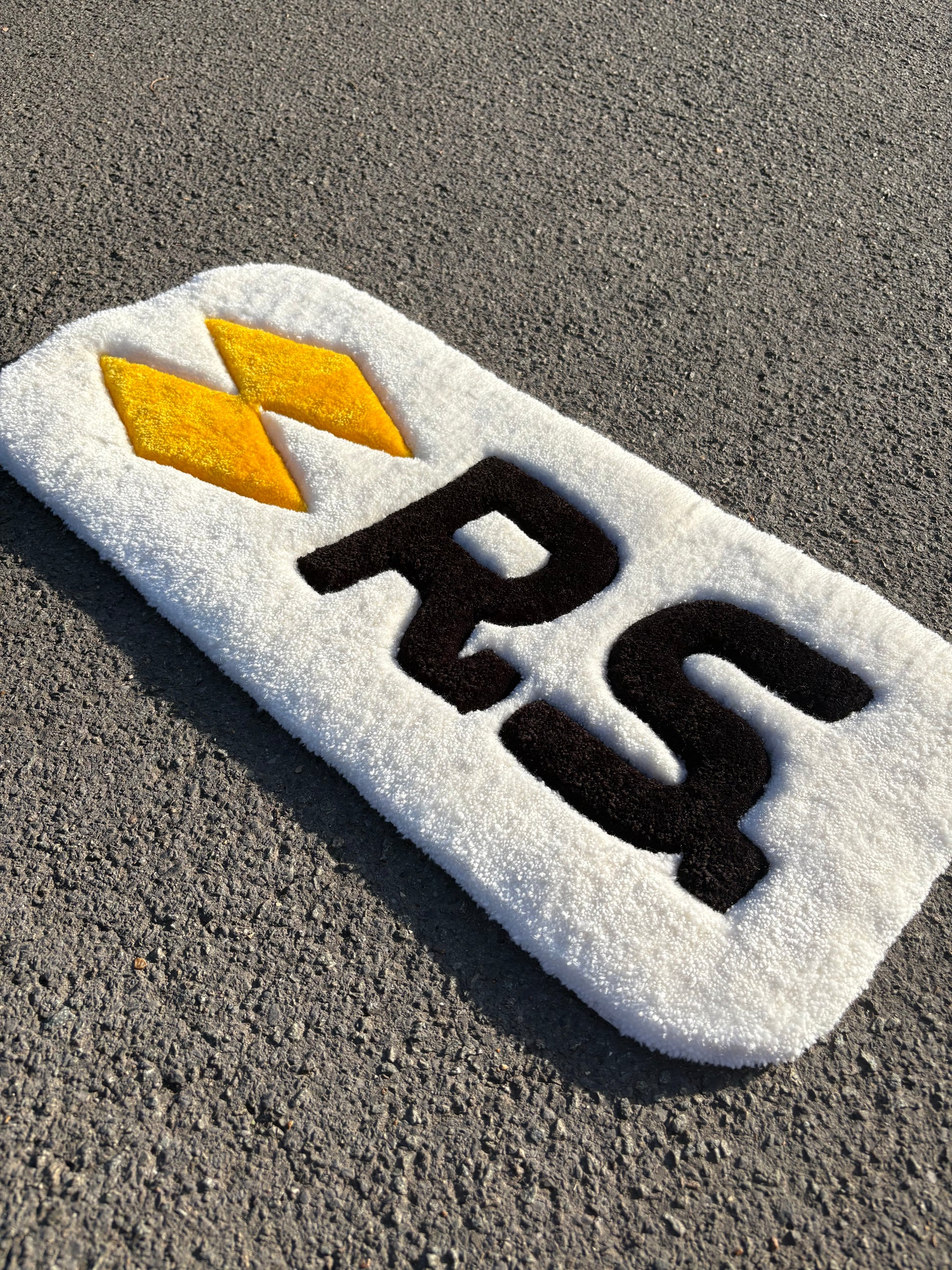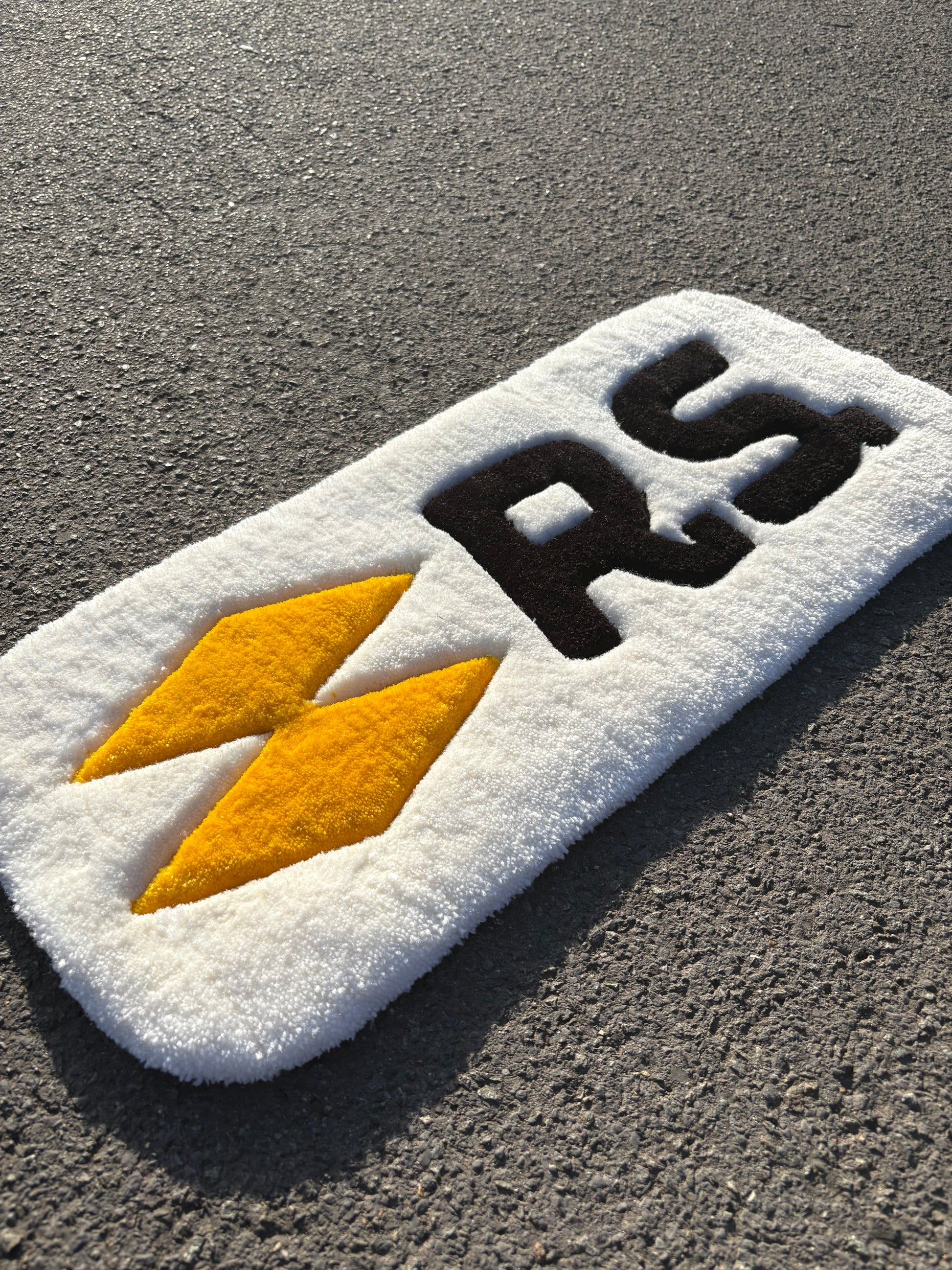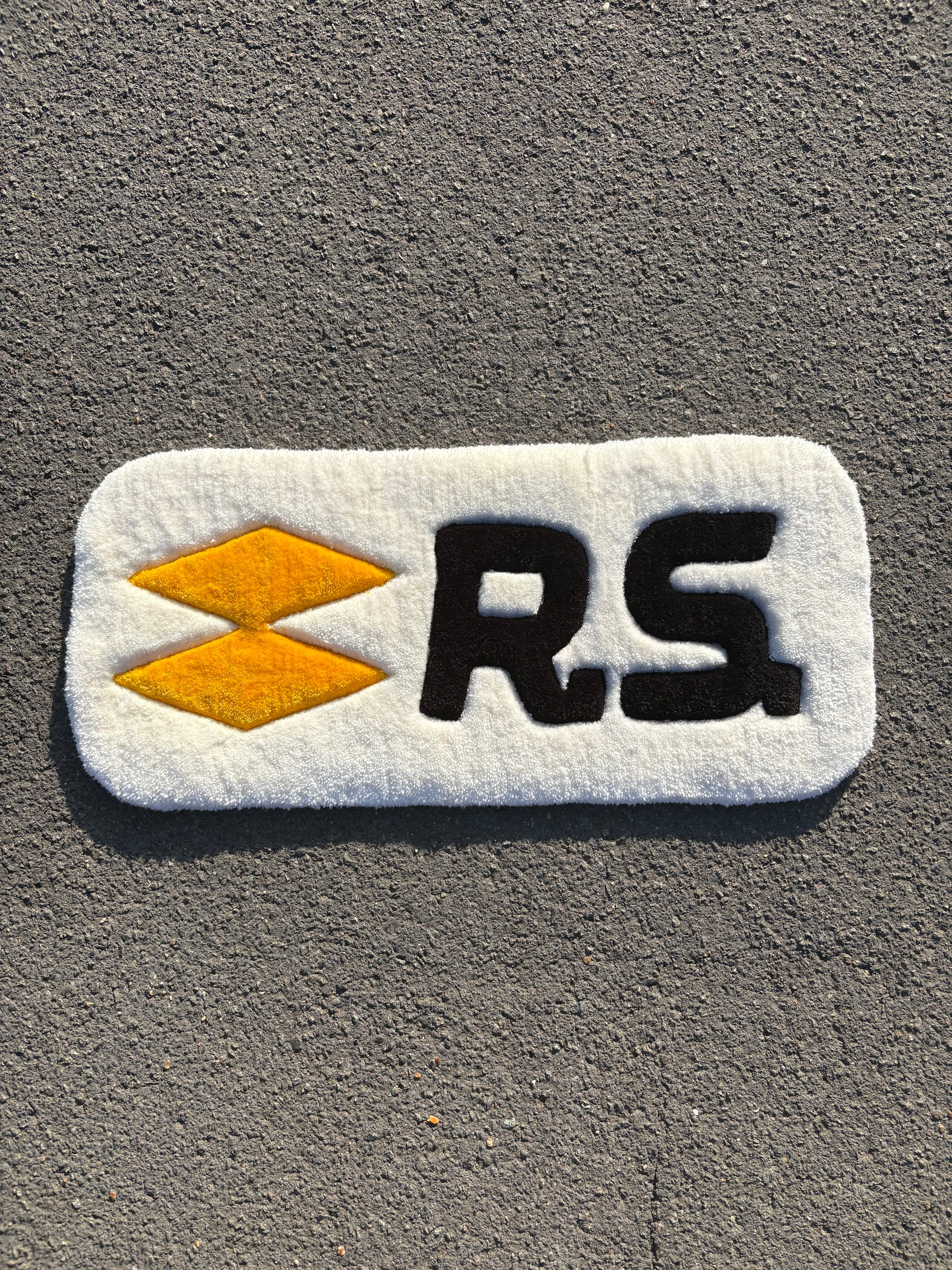 Ajoutez une touche de style unique à votre intérieur ou à votre setup avec ce tapis RS ultra tendance. Fabriqué à la main, il affiche un design accrocheur avec ses losanges jaunes et son lettrage noir sur fond blanc doux et moelleux. Parfait pour les fans de voitures, les passionnés de tuning ou tout simplement ceux qui aiment les objets stylés.